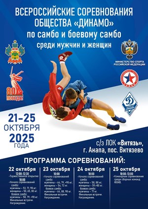 В период с 21 по 25 октября 2025 года в спортивном зале ЛОК Витязь города-курорта Анапа, посёлок Витязево, состоятся Всероссийские соревнования Общества "Динамо" по самбо и боевому самбо, среди мужчин и женщин. В соревнованиях принимают участие 306 человек, в том числе ЗМС-11, МСМК-23, МС-116, КМС-109, сборные команды из 23 регионов РФ.