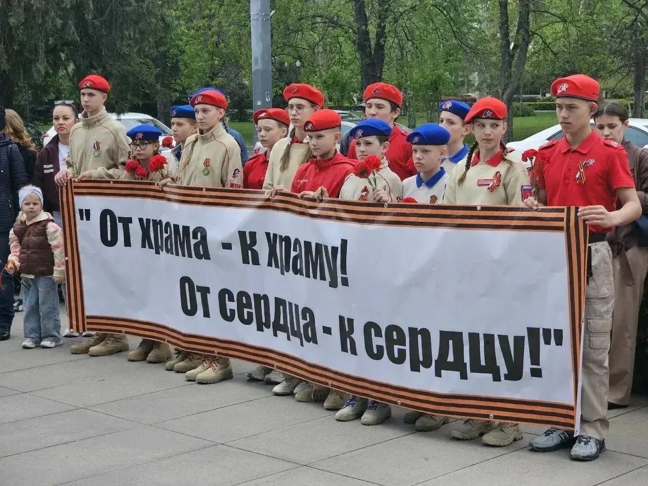 Ученики школы №35 передали горящую лампаду Почётному караулу Поста №1. Памятный митинг и возложение цветов к мемориалу прошли на площади перед Дворцом спорта «Динамо».