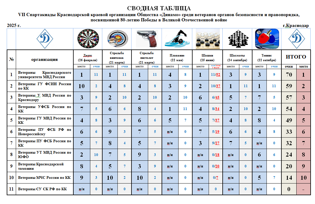 Сводная таблица результатов соревнований среди ветеранов-пенсионеров органов безопасности и правопорядка